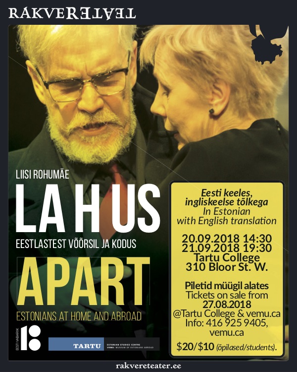 Friday, September 21 at 7:30pm, Rakvere Theatre will perform APART. Estonians at Home and Abroad at Tartu College. The play is set in the archives of Tartu College where a journalist and plitician get trapped. They both have something to hide from each other. Strange stories begin to unravel in the archives all together making up the story of the Estonian diaspora.