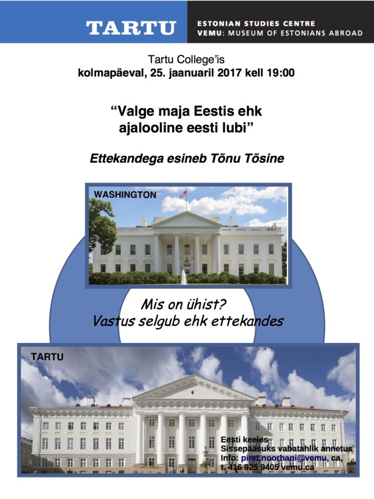 Wednesday, January 25th at 7pm at Tartu College, Tõnu Tõsine will be giving a lecture on the topic: The Estonian White House or a Historical Perspective of Estonian Limestone.