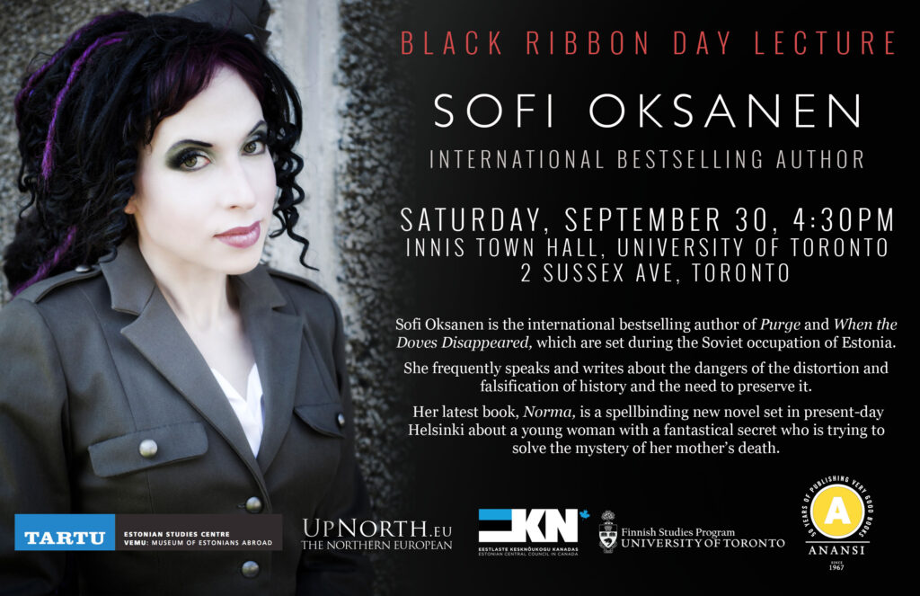 Saturday, September 30th at 4:30pm, the Estonian Central Council in Canada, UpNorth.eu, U of T Finnish Studies Program, House of Anansi Press, and ESC/VEMU present a Black Ribbon Day lecture at the University of Toronto Innis Town Hall (2 Sussex Ave, Toronto). The guest speaker is the international bestselling author, Sofi Oksanen, who will speak about the politicization and falsification of history.