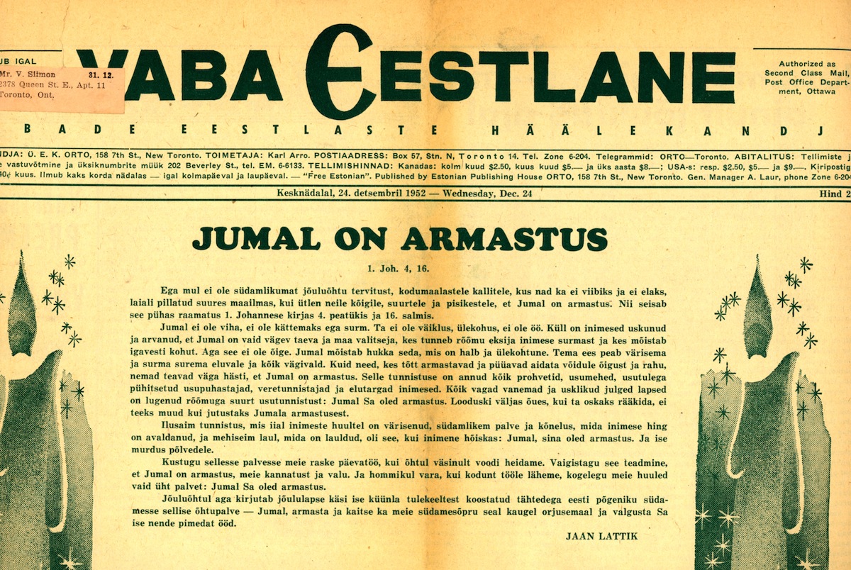 The Estonian Studies Center/VEMU extends warm wishes for a merry Christmas and a happy New Year to its supporters, volunteers and friends with a sampling of materials from the VEMU archives reflecting the spirit of Christmases past.