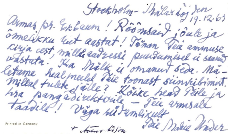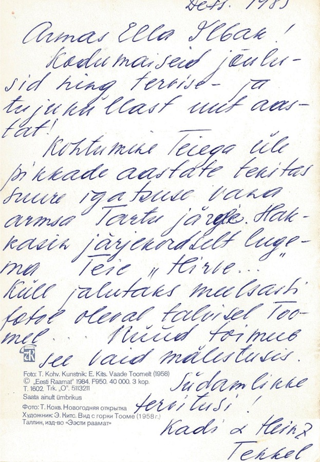 The Christmas card of Kadi and Heinz Tekkel to Ella Ilbak.