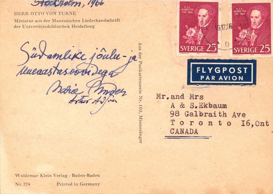 The Christmas cards of Marie Under and Artur Adson to Salme and Artur Ekbaum 1963-1966