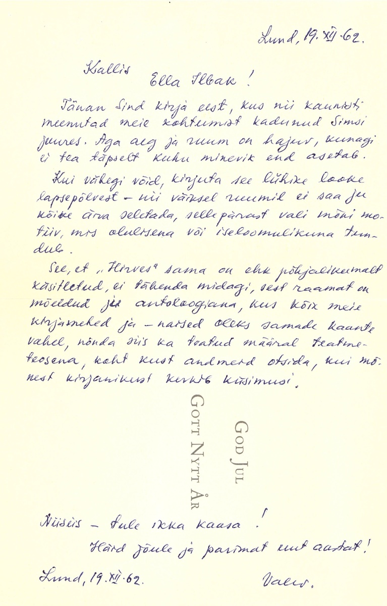 Valev Uibopuu’s Christmas card to Ella Ilbak 19.12.1962