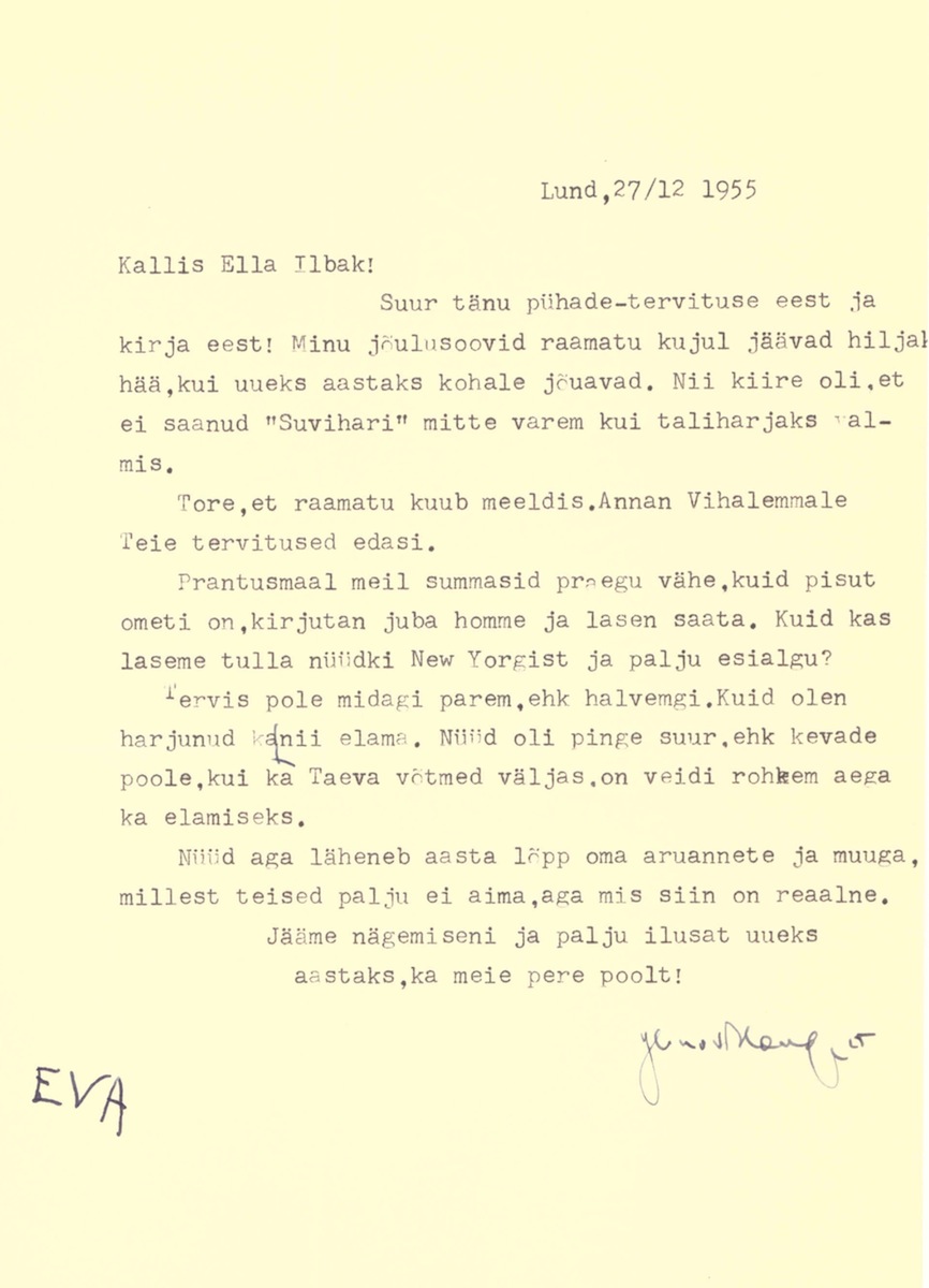 Bernard Kangro’s letter to Ella Ilbak signed also by