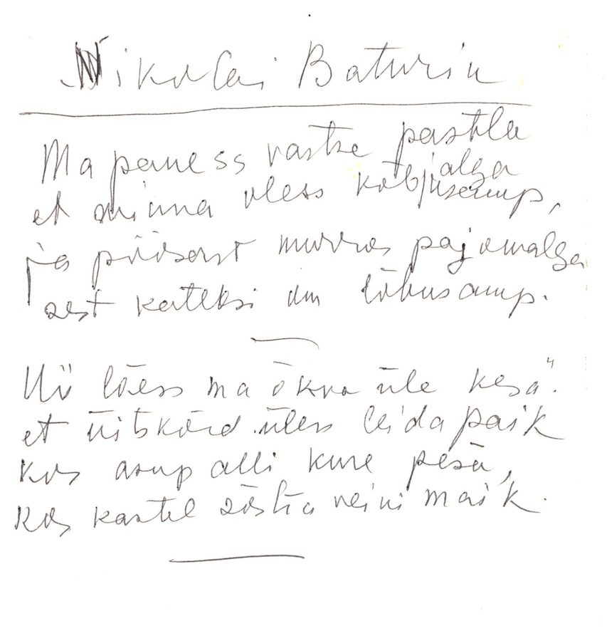 Nikolai Baturin’s poem in Ella Ilbak’s hand: “ I ‘d  put on my new moccasins,