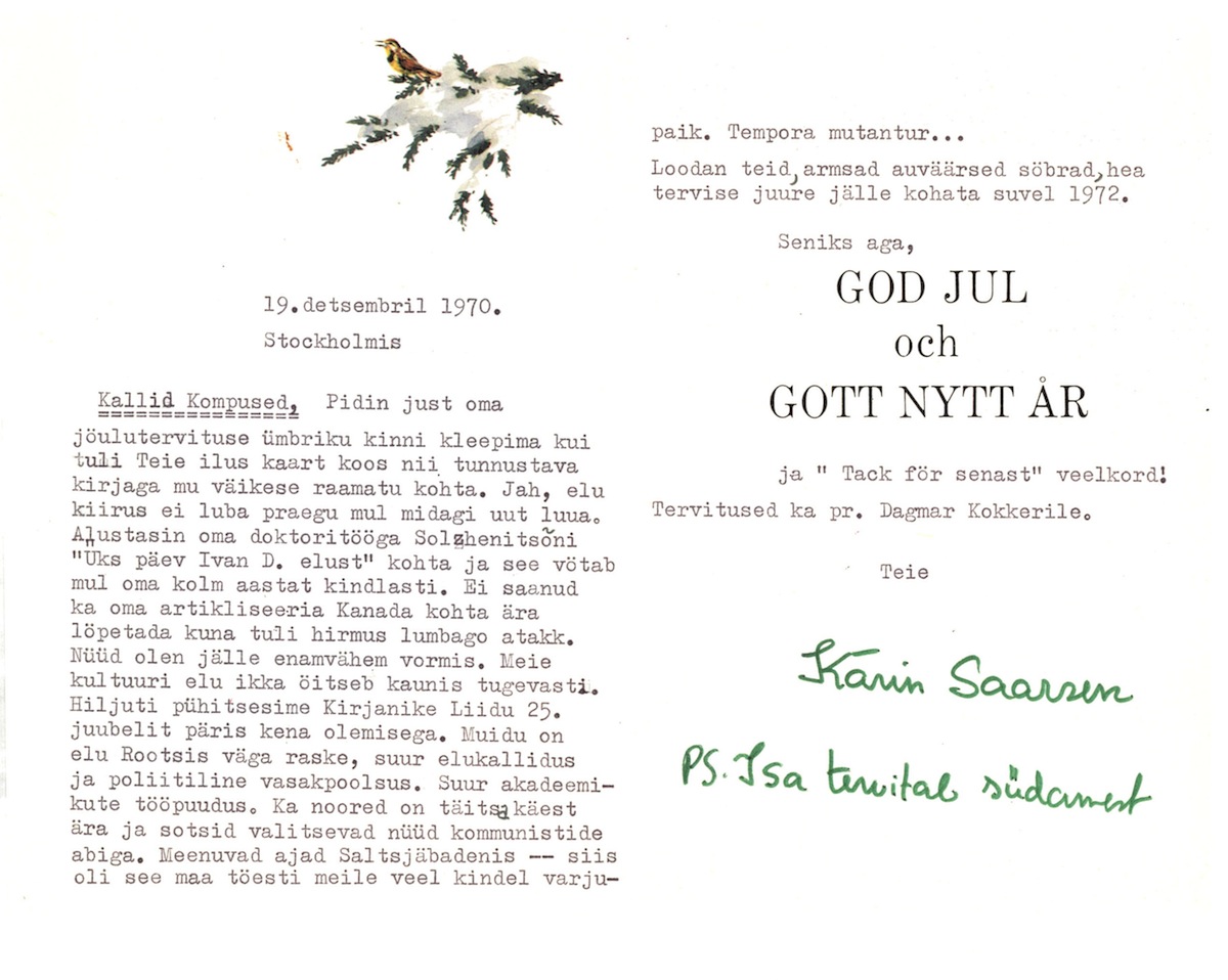 Joann Saarniit’s Christmas cards to Hanno Kompus and Rahel Olbrei.